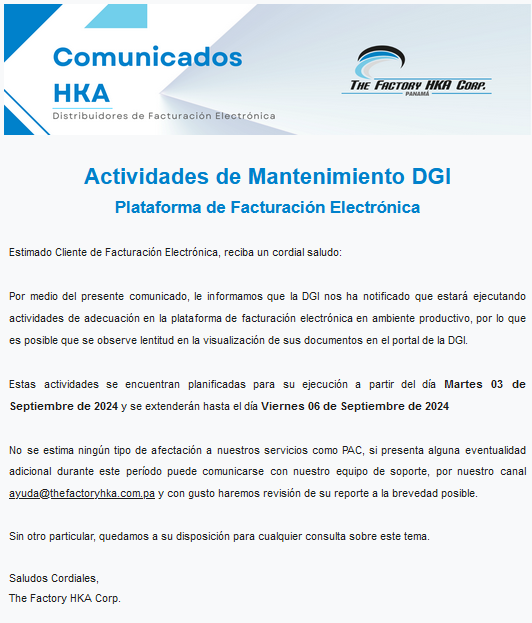 ¡Mantegase Informado! DGI Notifica Actividades de Mantenimiento de Plataforma de Facturación Electrónica entre el 03/09 y el 06/09 3 de septiembre de 2024 15:49 Actualización Relacionada con COMUNICADOS DGI