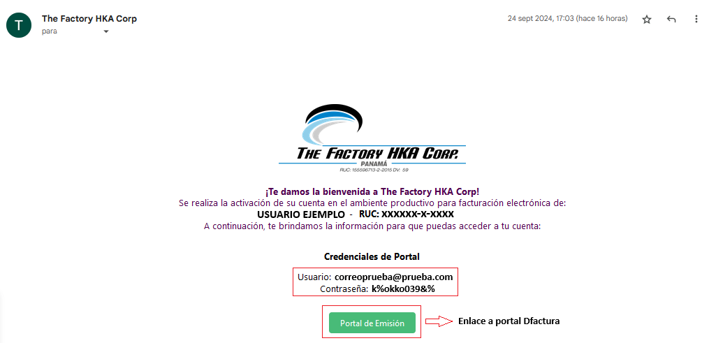 Las credenciales de facturación electrónica llegaran vía email, desde la dirección notificaciones@thefactoryhka.com.pa, con el asunto "Bienvenido a The Factory HKA Corp". El mismo le indica que se ha activado su usuario en la plataforma HKA en Ambiente Productivo.