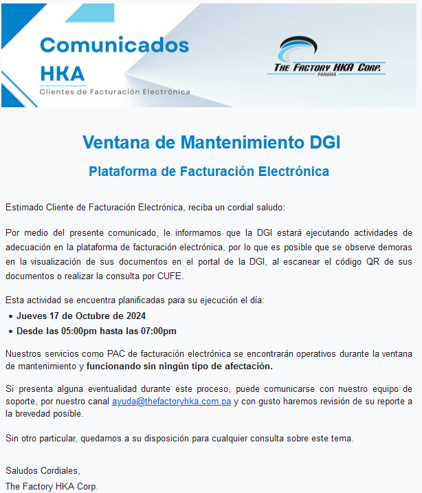 ¡Mantengase Informado! DGI notifica ventana de mantenimiento para el día 17/10/2024 de 05:00pm a 7:00pm 16 de octubre de 2024 17:21 Actualización Relacionada con COMUNICADOS DGI Artículos relacionados INSTRUCTIVO FLOWPRO - Nota de crédito referenciada por CUFE
