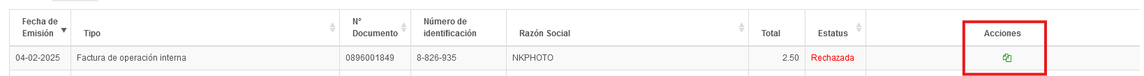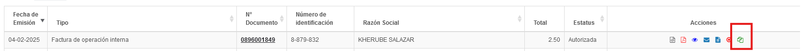 - Vamos a la sección de documentos emitidos, localizamos el documento que deseamos clonar, en la columna acciones, ubicamos el botón de clonar