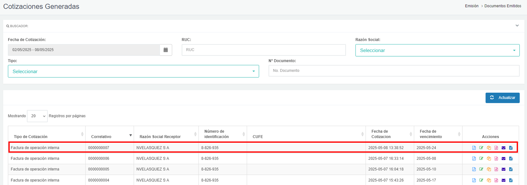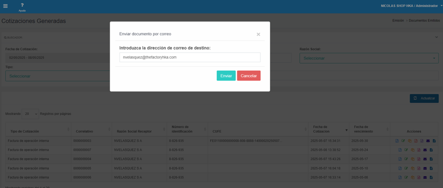- Una vez generamos la cotización se nos abrirá la Pagina de Cotizaciones generadas donde podremos ubicar la cotización realizada para realizar el reenvió de la misma por correo
