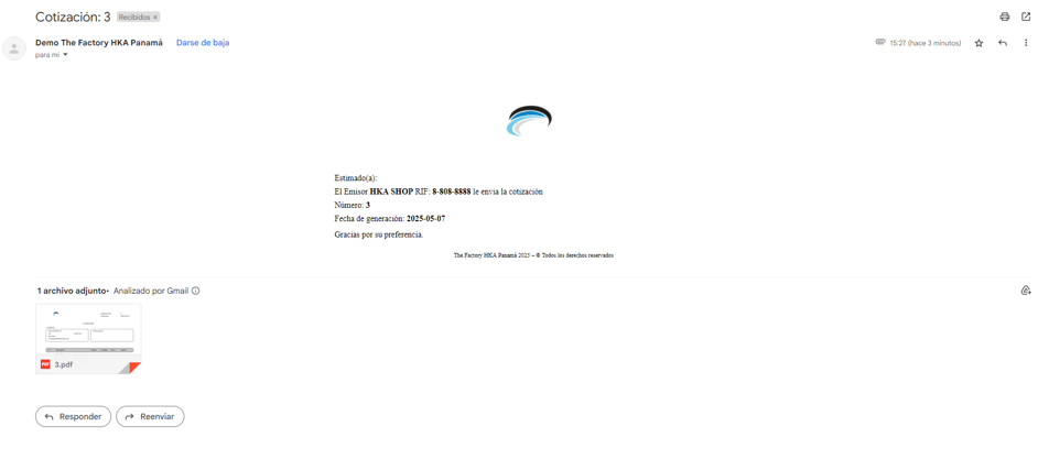- Recibiremos el correo con la cotización en el correo indicado con el pdf adjunto del mismo: