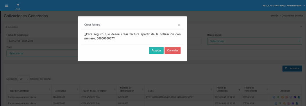 - En esta misma columna de acciones tenemos las opciones de generar el pdf de la cotización, editar la cotización, clonar la cotización y la de generar una factura electrónica en base a nuestra cotización, procedemos a darle al botón de generar factura