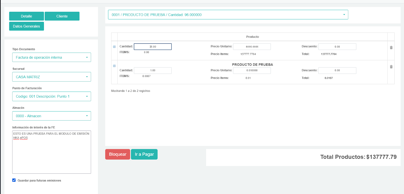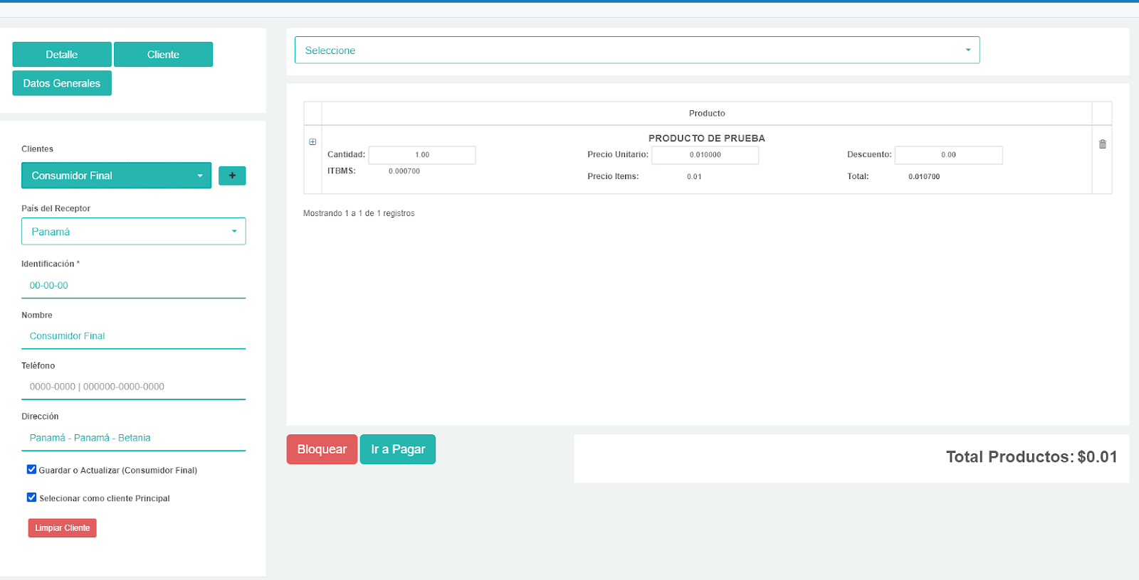 : Tipo de Documento, Sucursal, Punto de Facturación, Información de interés de la FE (este dato es opcional), elegimos el producto a facturar. Una vez llenamos los datos de la sección