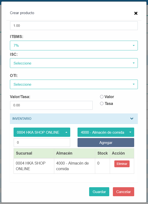 Recuerde que para que esta opción funcione correctamente, debe tener previamente creado al menos un Almacén en la sección de Inventarios. Si el producto es un servicio, NO ES NECESARIO relacionar un almacén o asignar stock, simplemente complete los datos fiscales y guarde.