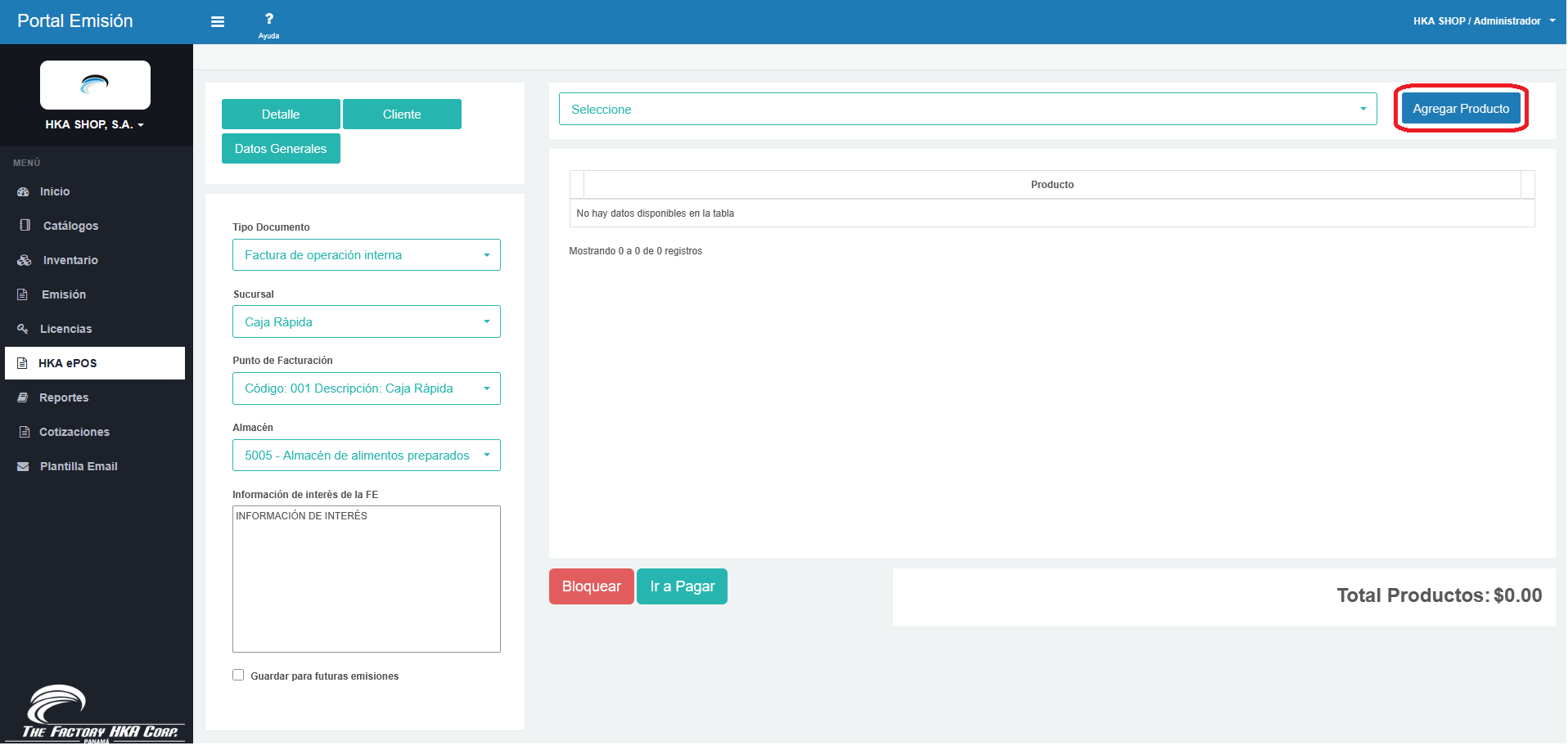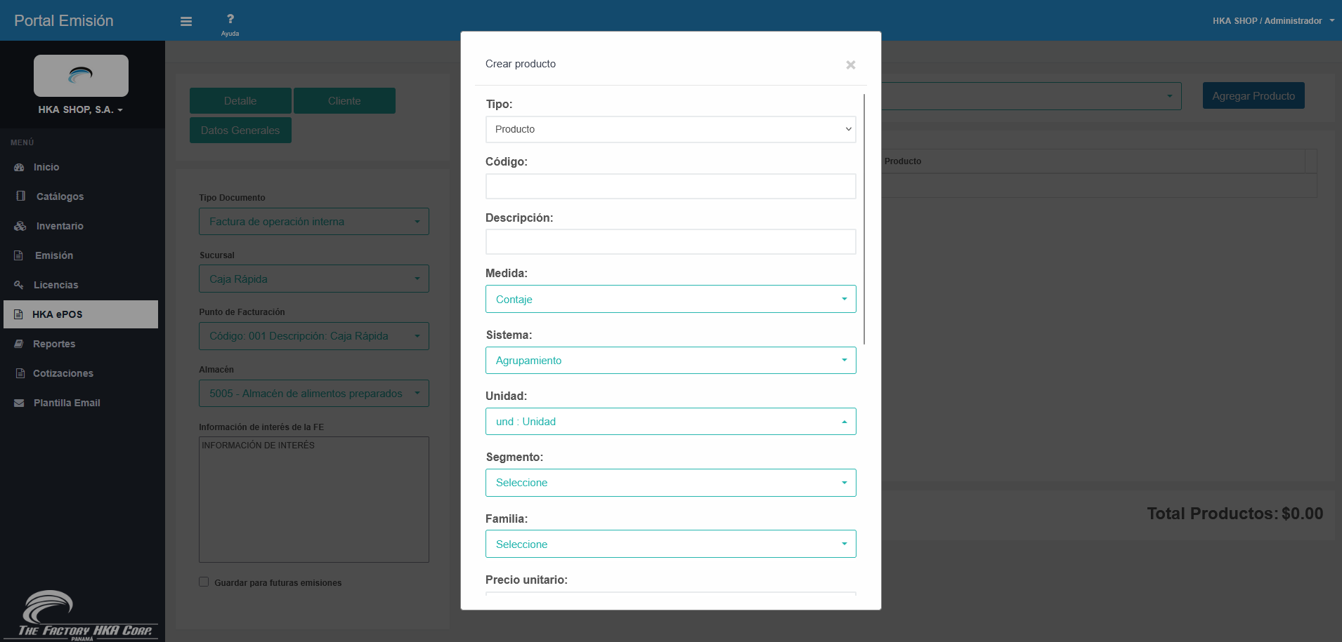 Mientras se encuentra en la pantalla de HKA ePos → Generar Documentos, busque el botón "Agregar Producto" ubicado justo al lado del buscador de ítems. Al hacer clic, se desplegará una ventana flotante.