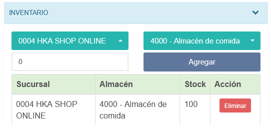 Asociación a Almacén de Productos: Recuerde que los ítems de tipo Servicio no es necesario agregarlos a un almacén. El sistema le permite seleccionar a qué almacén desea vincular este nuevo producto, para lo cual debe seleccionar Sucursal, Almacén y puede dejar el stock en 0 o agregar existencia al inventario. Posteriormente presione el botón "Agregar" para que se asigne el producto y stock/existencia al almacén correspondiente.